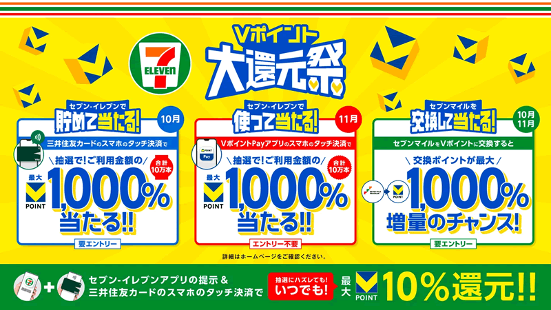 セブン-イレブン×Vポイント1周年記念!最大1,000%還元の「Vポイント大還元祭」開催