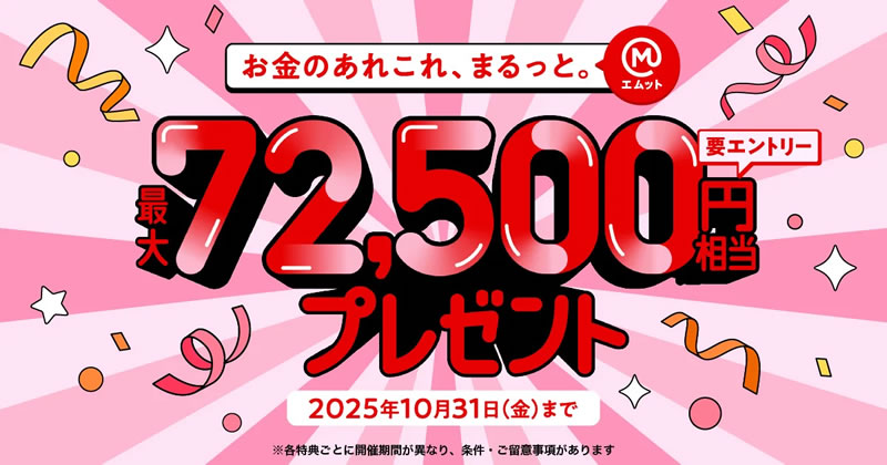 三菱UFJ銀行の新ブランド「エムット(Emmut)」が、最大72,500円相当の特典がもらえるキャンペーンを実施中です。